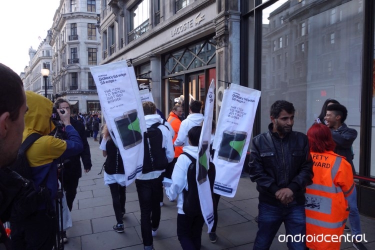 برخی از کارکنان سامسونگ با در دست داشتن بنرهای محصولات پرچمدار این برند سعی در یادآوری محصولات جدید خود به خریداران آیفون داشتند.