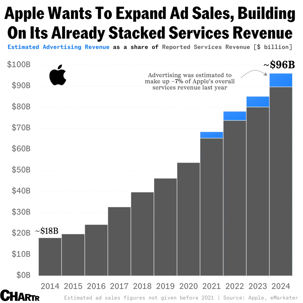 اگر روند فعلی رشد بخش خدمات اپل ادامه یابد، انتظار میرود سهم درآمد تبلیغات اپل از کل درآمد شرکت تا سال ۲۰۲۷ به بیش از ۱۰ درصد برسد. اپل با ترکیب هوش مصنوعی، موقعیت جغرافیایی و دادههای رفتاری، به دنبال ایجاد سیستمی است که تبلیغات را دقیقتر، شخصیتر و با حفظ حریم خصوصی ارائه دهد.